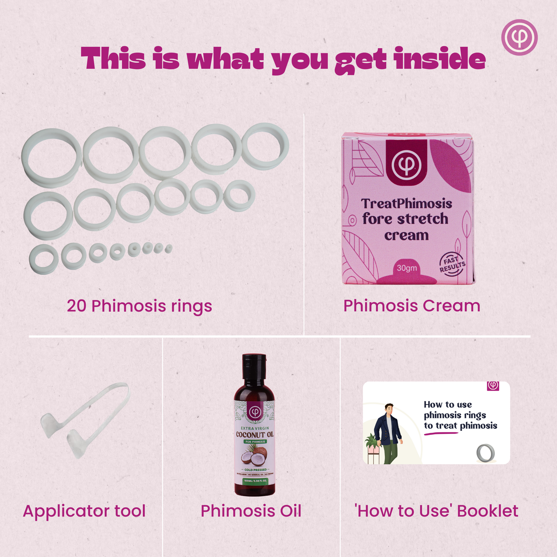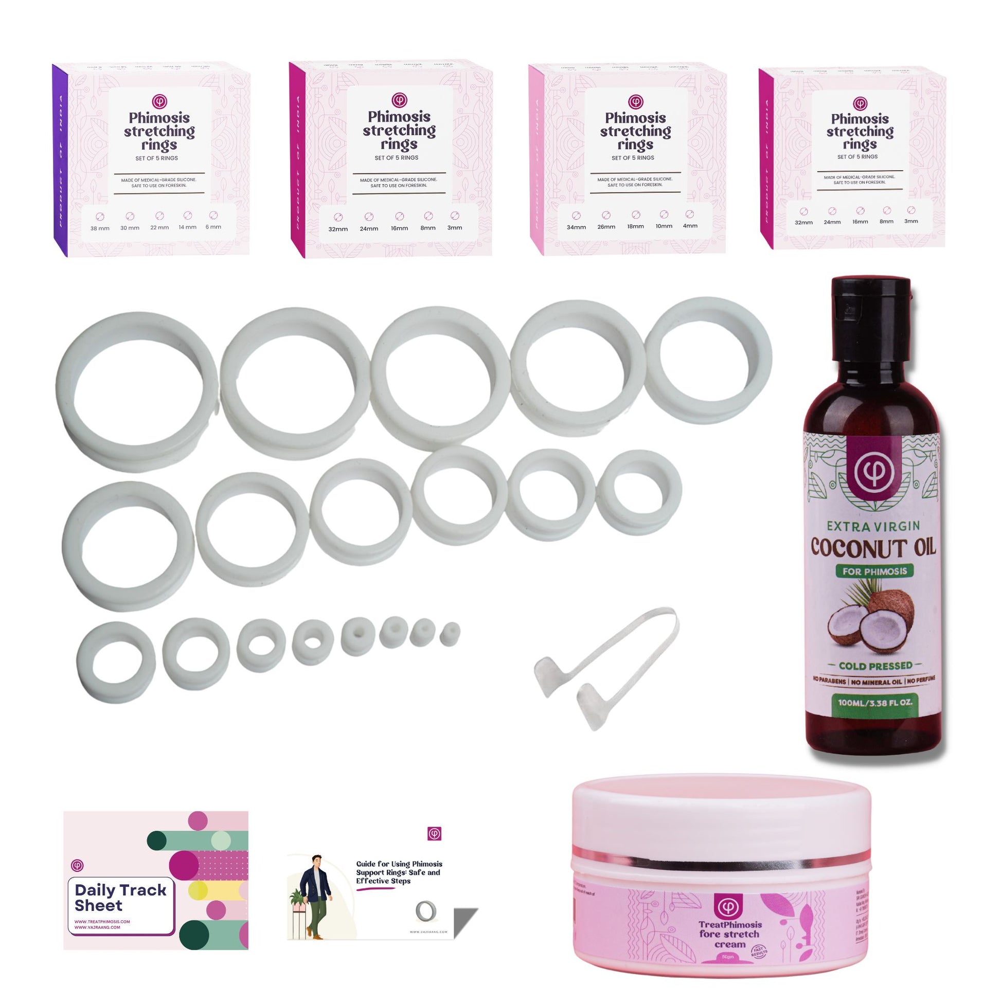 Treat Phimosis stretching rings (20 rings), fore-stretch cream, phimosis oil, ring removal tool & information booklet on treating phimosis at home